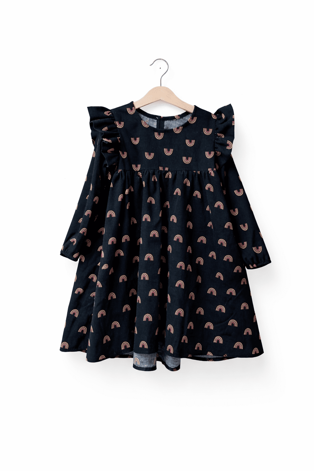 Sukienka dziewczęca, łączy w sobie elegancję i wygodę. Rozszerzający się krój, idealnie pasuję na każdą sylwetkę. Rękawy z pięknymi falbankami. Tył delikatnie dłuższy.